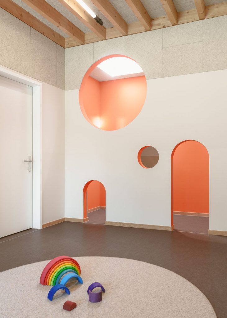REFERENZEN Die Innenräume sind von sichtbarem Holz, hellen Mineralflächen und widerstandsfähigen Bodenbelägen geprägt. Das taktile, warme Materialbild reduziert Reizüberflutung und