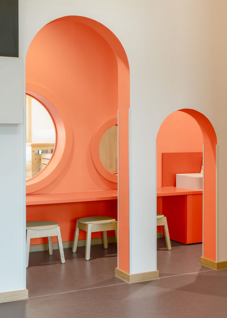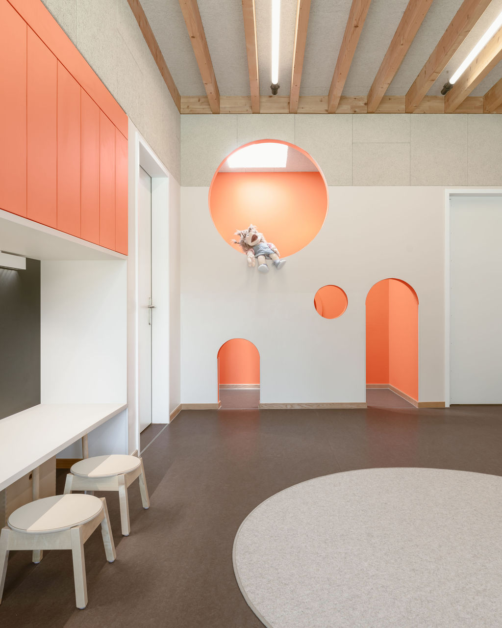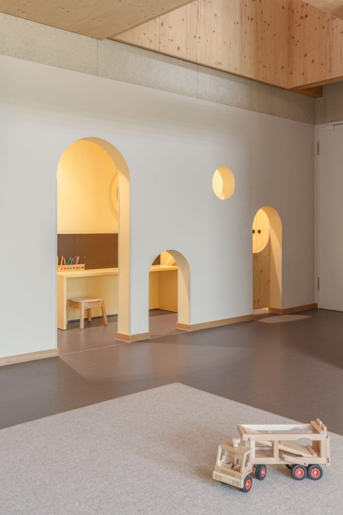 Die Grundidee folgt dem Prinzip der „vorbereiteten Umgebung“: Räume leiten, statt zu lenken. Großzügige Gruppenbereiche verzahnen sich mit Spielgalerien, Bewegungslandschaften und Rückzugsnischen. Kreis- und Bogenöffnungen, Durchkriechgänge und Podeste schaffen eine abwechslungsreiche Topografie in Kindermaßstäblichkeit. Transparenz ermöglicht Orientierung und Aufsicht, gleichzeitig bieten differenzierte Zonen Schutz und Intimität – essenziell für die emotionale Sicherheit und damit für selbstbestimmtes Lernen.
