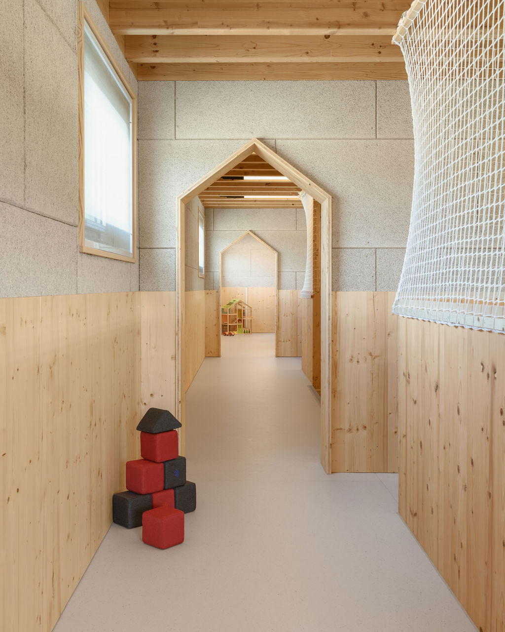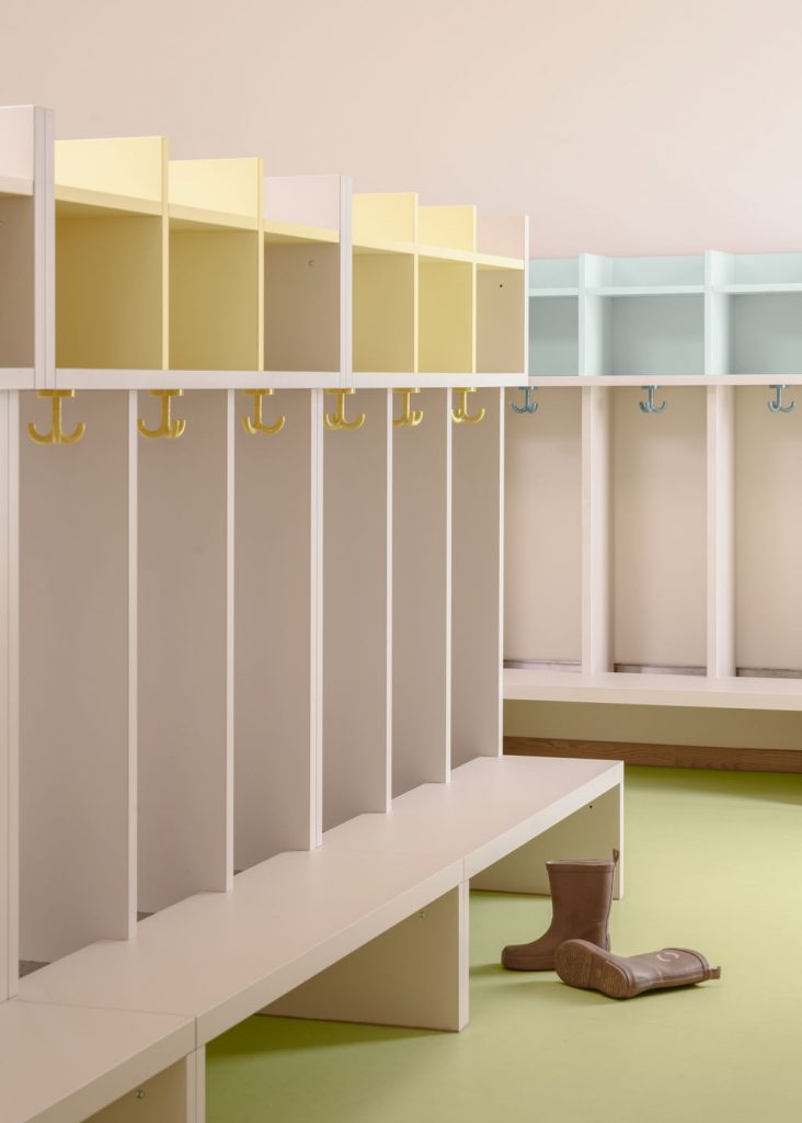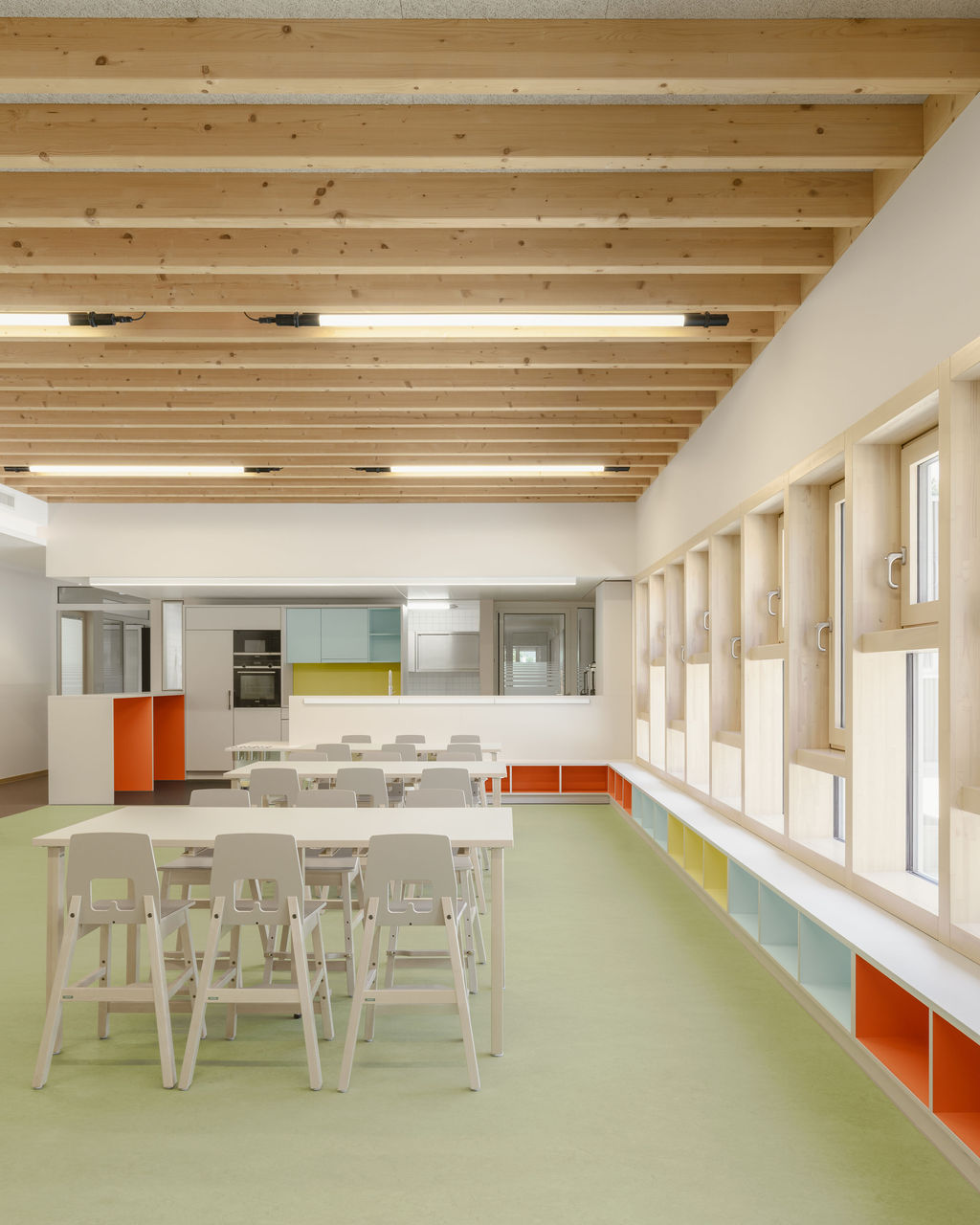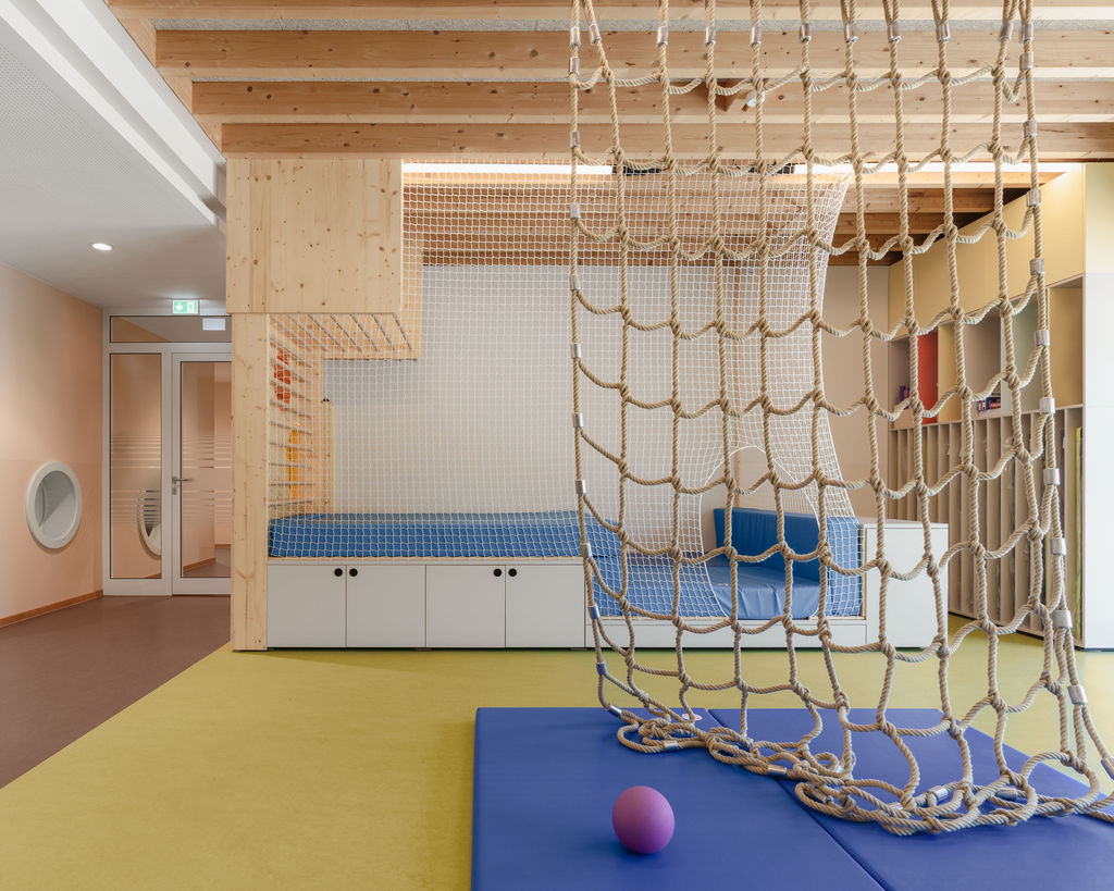 Die Innenräume sind von sichtbarem Holz, hellen Mineralflächen und widerstandsfähigen Bodenbelägen geprägt. Das taktile, warme Materialbild reduziert Reizüberflutung und unterstützt ein ausgeglichenes Raumklima. Akustisch wirksame Decken und Möbelfronten senken den Geräuschpegel – eine zentrale Voraussetzung für mentale Regeneration und konzentriertes Spiel. Großzügige Fensterbänder, Sitznischen in den Laibungen und integrierte Stauraummodule verbinden Tageslichtführung mit klarer Ordnung; was die Kinder brauchen, ist in Griffhöhe und sichtbar.